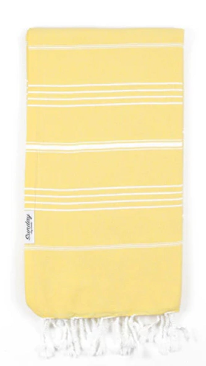 • A luxurious 3'x6' Turkish towel, in cheerful yellow, perfect for poolside or a picnic blanket or even wear as a shawl on a evening